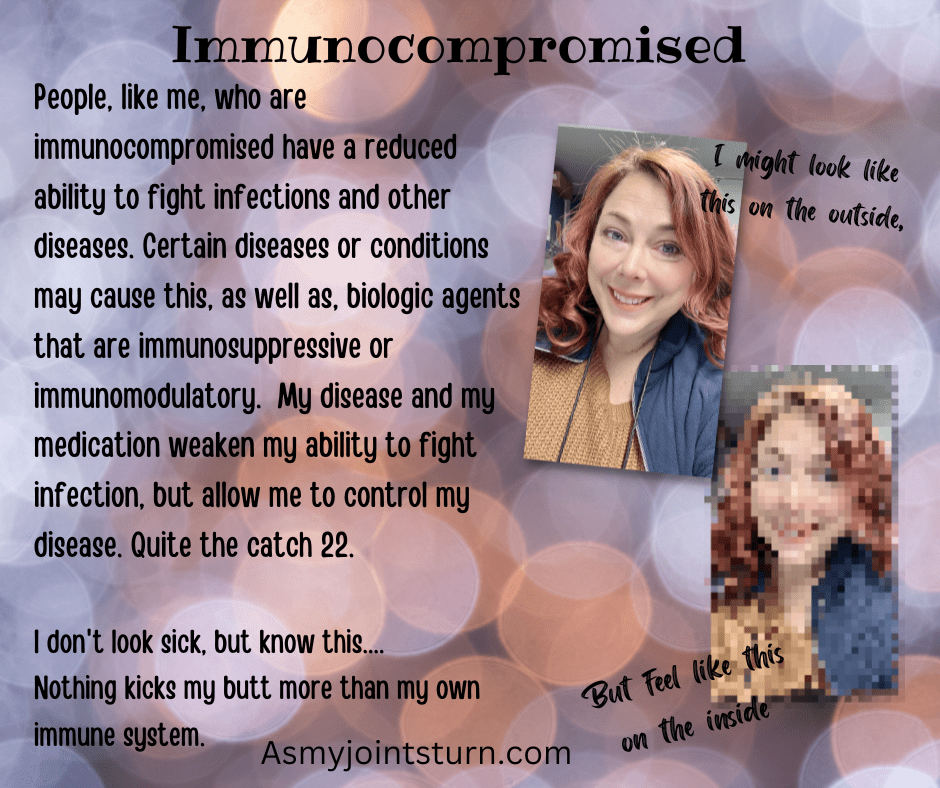 I’m still on the fence about attending social gatherings, and I know people will be upset/annoyed with me if I don’t join in with the holiday cheer. Does that matter to me? Sadly, yes it does. I want to be social, but I need to focus on my health. I may not look sick, but I’m hanging on by a thread physically and emotionally. I’m even contemplating postponing my Inflectra infusion so I don’t risk getting sick AGAIN, fully aware that my body will pay the price. I plan to reach out to my rheumatologist this week to discuss options.