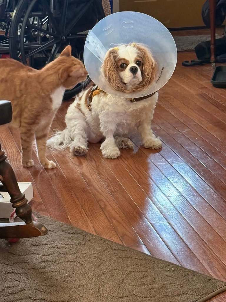 And at the same time—I’m just a person. A tired, grieving, stressed, trying-my-best person… who happens to be surrounded by medically complex animals and a dog wielding a cone like a weapon.